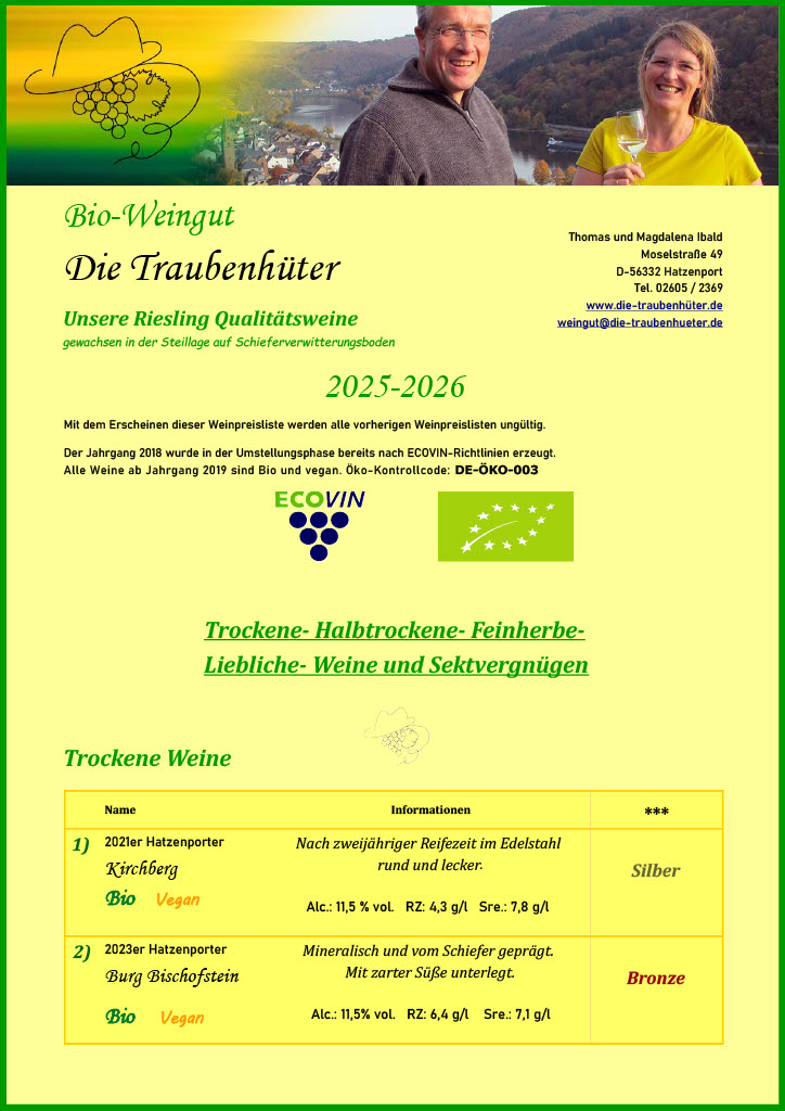 Nach langer Lagerung auf der Grobhefe bis zum 22. Juni (!), schonender Filtration und Abfüllung am 28. August, steht der “neue” Jahrgang 2020 ab sofort auf unserer Weinliste zur Bestellung zur Verfügung. In der Tat gleicht der Charakter der Weine sehr dem Jahrhundertjahrgang 2018. Verhalten-mild in der Säure und cremige Fruchtigkeit besonders bei den Weinen mit Restsüße kennzeichnen die “Neuen”. Zum ersten Mal präsentieren die Traubenhüter einen lieblichen Riesling, ganz in der Tradition der Moselweine um die Wende zum 20. Jahrhundert:  zarte Süße, schlank im Alkohol, im wahrsten Sinne des Wortes ein “lieblicher” Charakter. Bei der Landesweinprämierung wurden wir mit drei silbernen und einer goldenen Kammerpreismünze für die Qualität belohnt. Sehr zum Wohl!