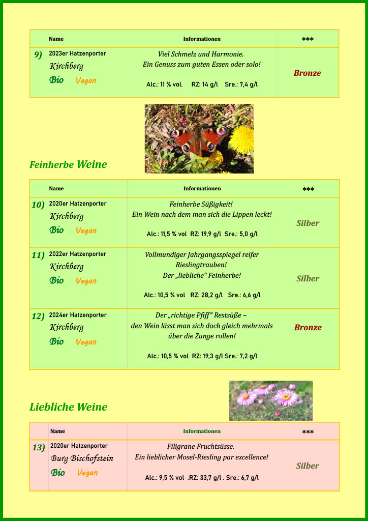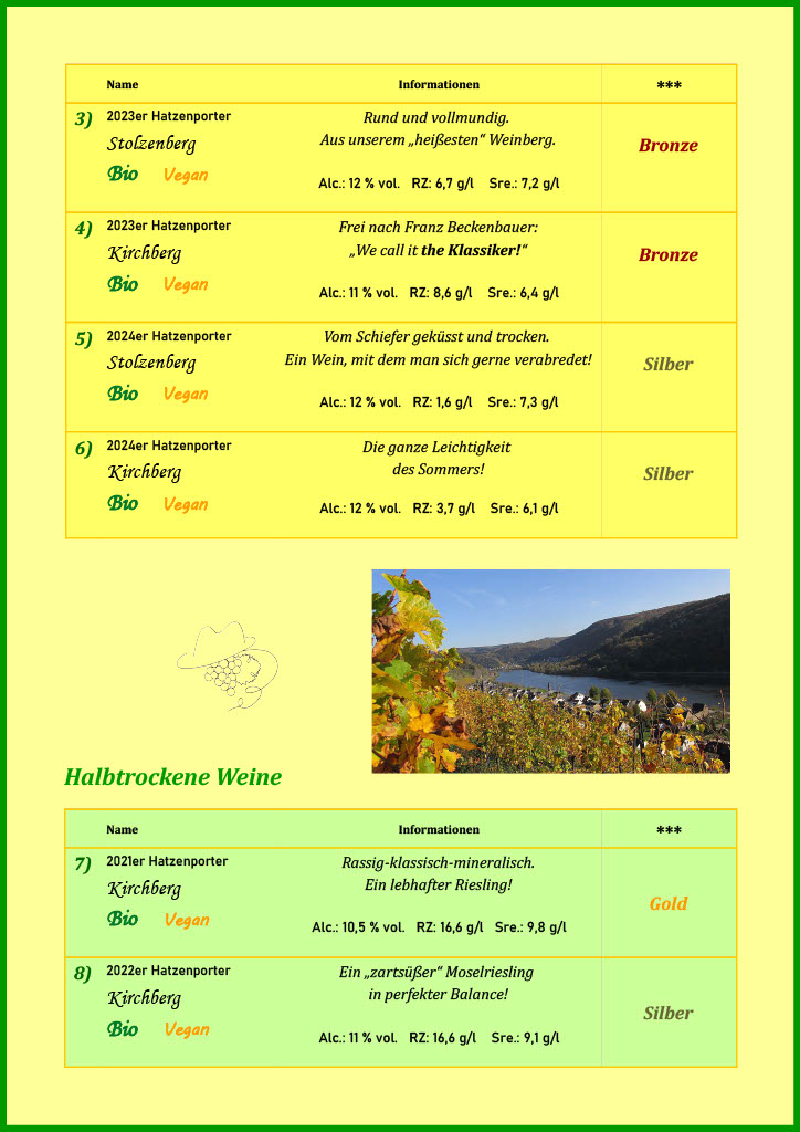 Fünf Individualisten haben Quartier in unserem Flaschenlager bezogen: aus jeder der drei Weinbergslagen eine trockene Variante und aus unseren Parzellen im Kirchberg noch einen Riesling halbtrocken, sowie als Krönung eine edelsüsse Auslese. Von der feinwürzigen Süsse dieses Weines überwältigt, haben wir uns zur Verwendung des Prädikates entschlossen.