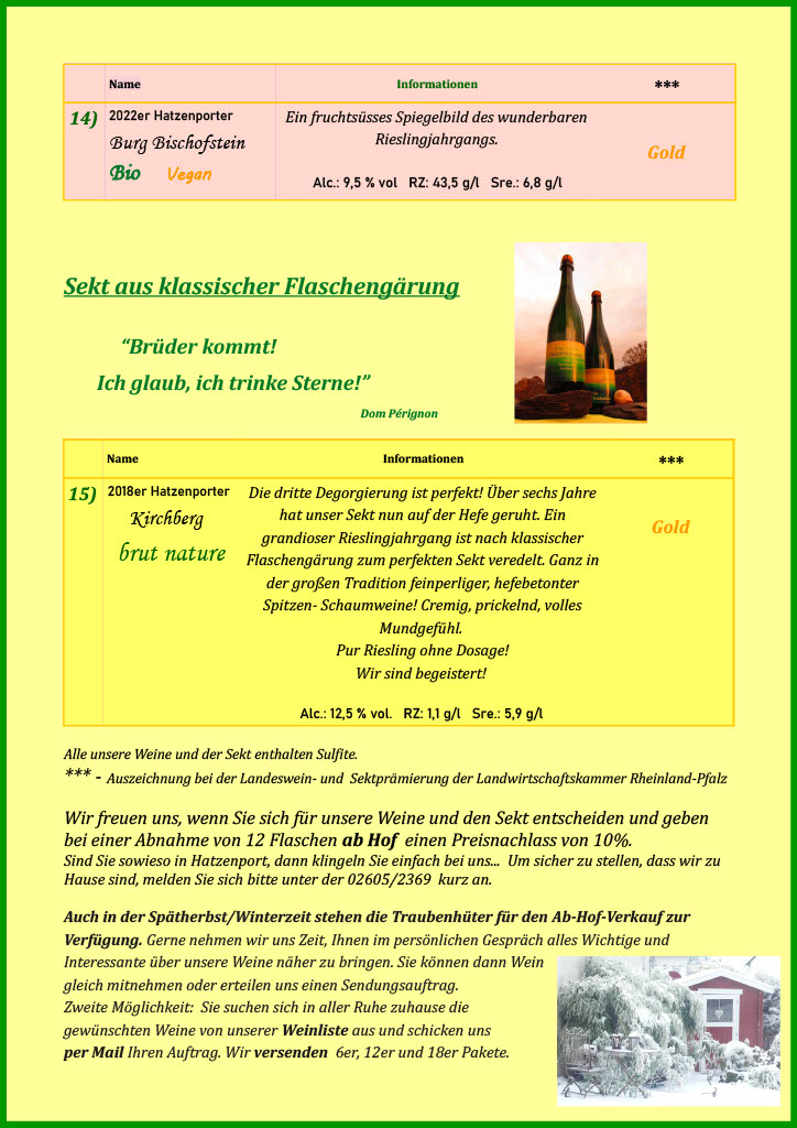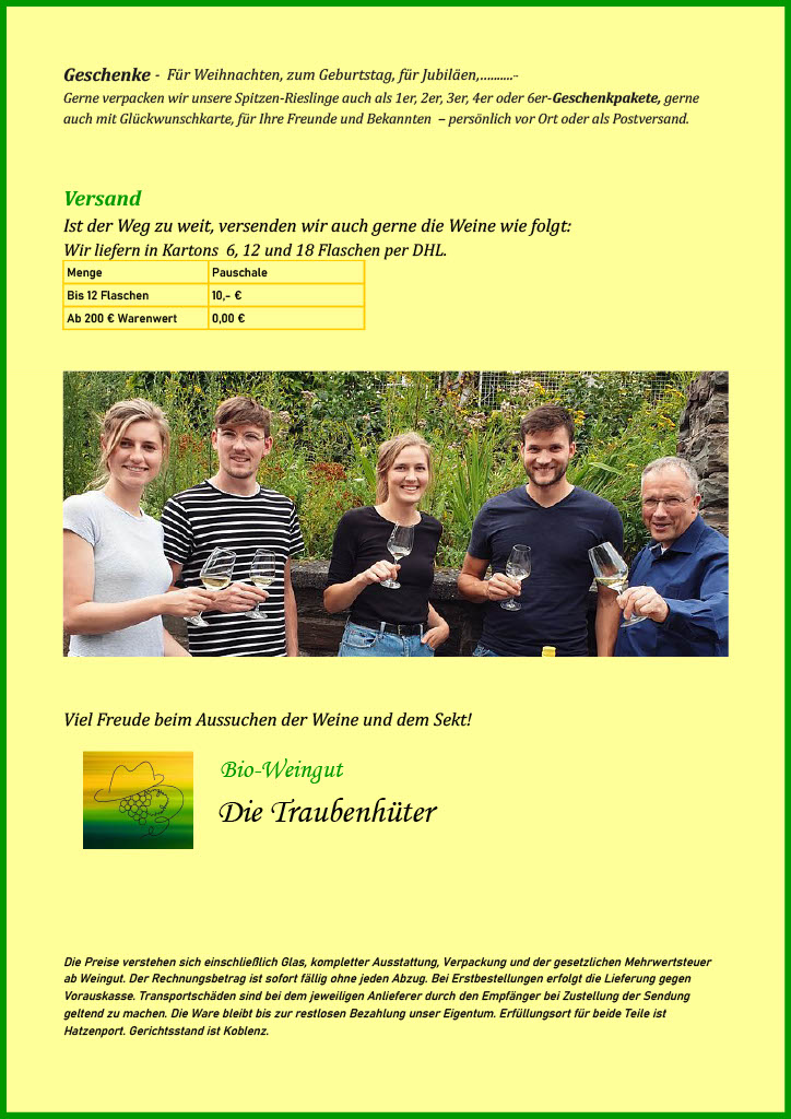 Da wir keinen Web Shop anbieten, dürfen wir aus rechtlichen Gründen, die Weinpreise nicht auflisten. Fordern Sie sich die Weinliste mit den Preisen an und bestellen damit ganz bequem online oder per Post.